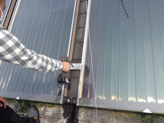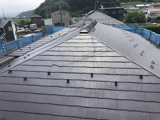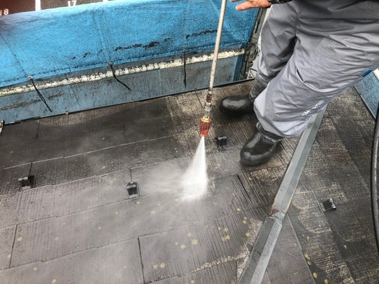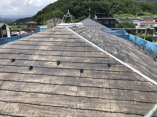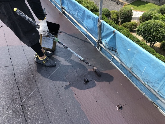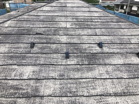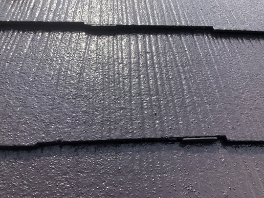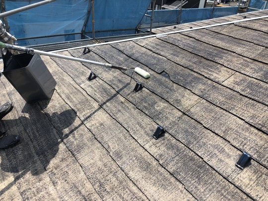 そして、入念に洗浄と清掃を行います。洗浄は屋根塗装の最初に行う一番大切で一番重要な工程です。時間をかけ丁寧に旧塗膜、汚れ等を洗い落とします。築年数の経過もあり、旧塗膜はほぼ残っていませんでした。その後、スレート屋根縁切り材新型タスペーサー01の挿入、下塗り、上塗りと続きます。