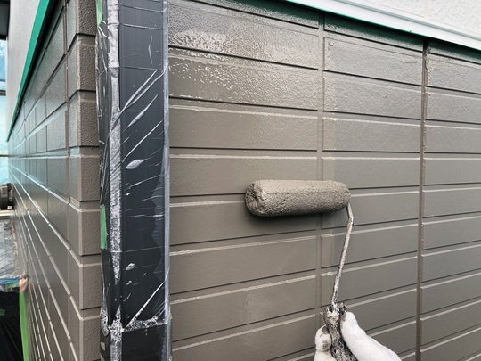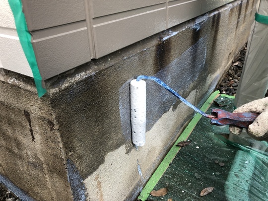 洗浄後丁寧に各所養生をし、外壁の傷んでいるヶ所の下地調整を行ってから下塗り工程にうつります。傷んだ部位に多めに下塗りを重ね塗りし、上塗りに続きます。樋や付帯物までしっかり下地処理をしてから塗っていきます。