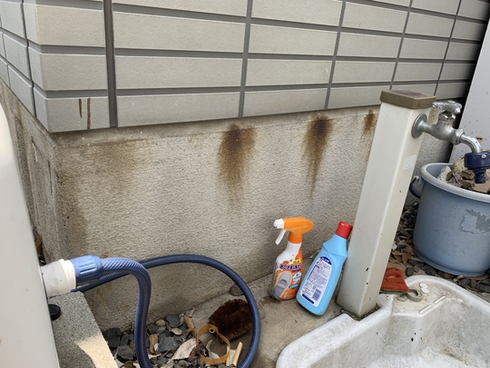 外壁塗装作業の妨げになる可能性のある植栽の剪定やエアコンホースカバー等の移動、外せるものを一旦壁から取外す作業は最初にやってしまいます。その後洗浄、清掃を行います。