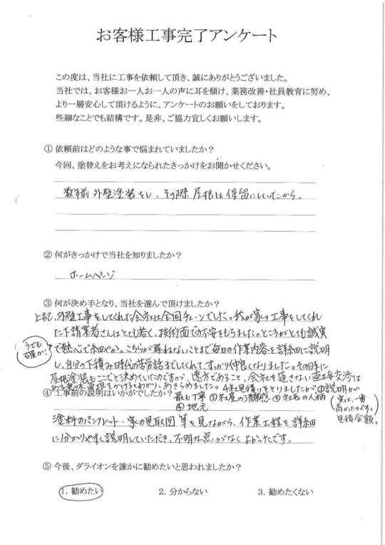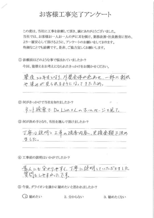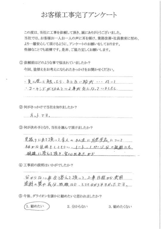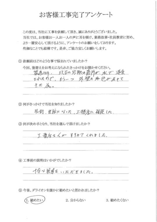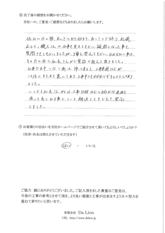 休みの日の朝、あいさつから始まりあいさつで終わり、礼儀正しく、職人さんの仕事も見せてもらい疑問になった事を質問させてもらいましたが、丁寧に答えてもらい、わからない事はその日のうちに社長さんから電話で教えて頂きました。仕事で日中いない時は、帰って来ると工事塗料などが1ヶ所にまとめて置いてあり、工事中にもかかわらずキレイにしてありました。いつでも社長さんからは工事日程などの細かな連絡を頂いて気になる事について解決してもらえて安心しました。(2019年9月)