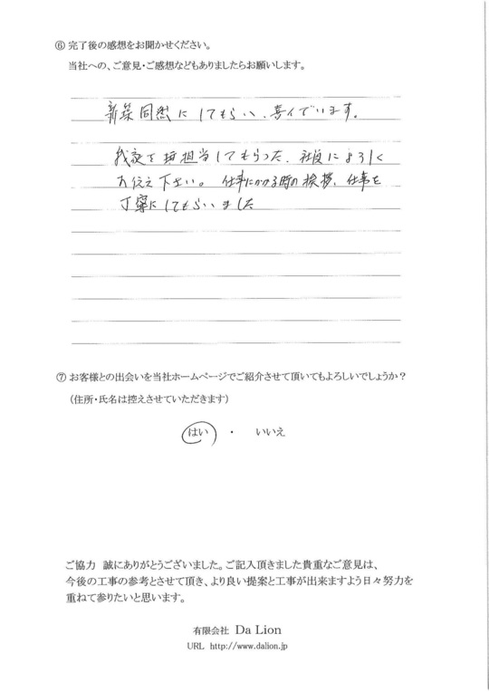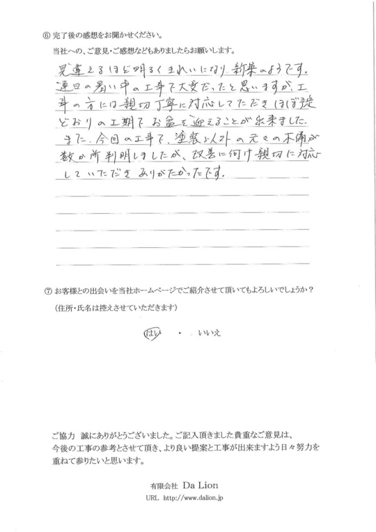 新築同然にしてもらい、喜んでいます。我家を担当してもらった社員によろしくお伝えください。仕事にかかる時の挨拶、仕事を丁寧にしてもらいました。(2019年10月)