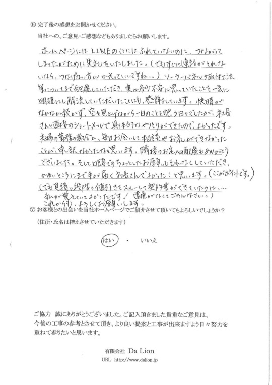 ソーラーパネルの取付工法等についてまで配慮していただき、実は多少不安に思っていたことを一気に明確に解決していただけたことにも感謝しています。快晴がなかなか続かず、空を見上げながら一日のことを想う日々でしたが、社長さんとの直接のショートメールで具体的なやりとりができたのでよかったです。夫婦に勤務の都合上、毎日お会いして相談やお礼ができなかったことが申し訳なかったなと思います。隣接のお宅への配慮もありがとうございました。そして口頭でのちょっとしたお願いももれなくしていただき、かゆいところにまで手が届く社長さんでよかった!と思います。(ここがポイントです。)(2019年9月)