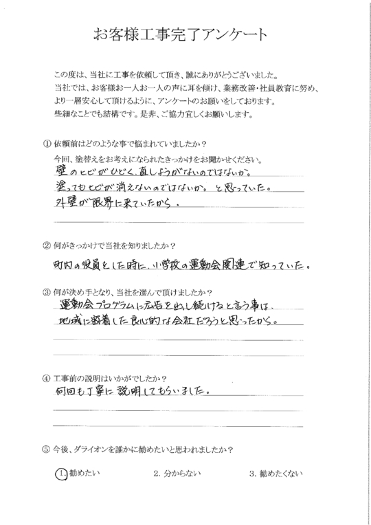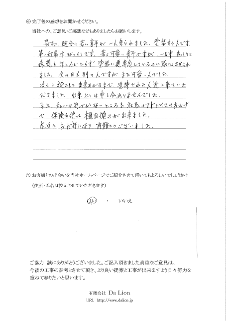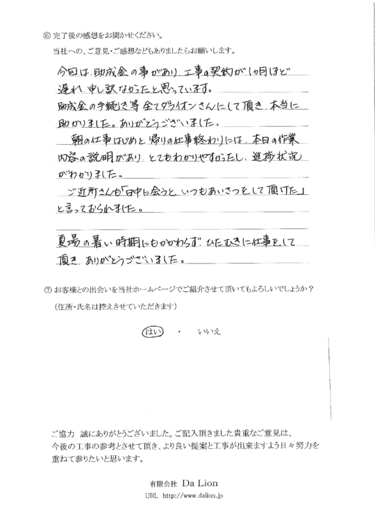 今回は助成金のことがあり、工事の契約が1カ月ほど遅れ申し訳なかったと思っています。助成金の手続き等全てダライオンさんにして頂き、本当に助かりました。ありがとうございました。朝の仕事はじめと帰りの仕事終わりには、本日の作業内容の説明があり、とてもわかりやすかったし進捗状況がわかりました。ご近所さんも「日中会うといつもあいさとをして頂けた」と言っておられました。夏場の暑い時期にもかかわらずひたむきに仕事をして頂き、ありがとうございました。(2020年10月)