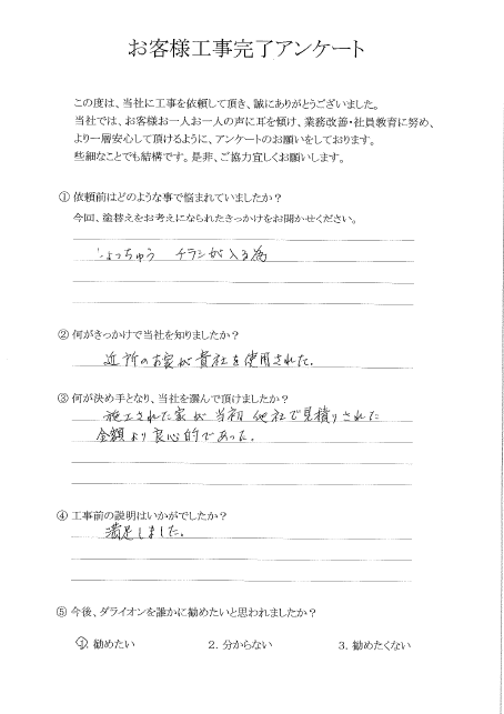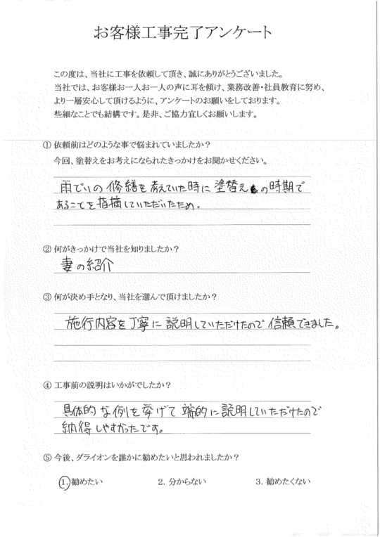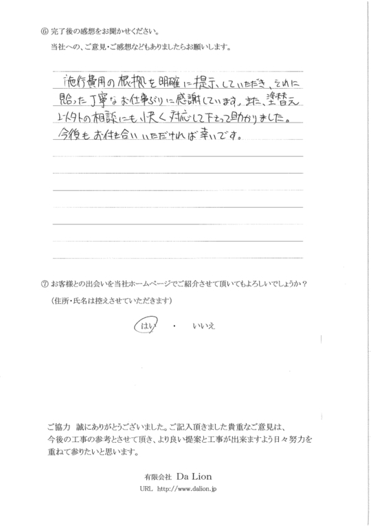 施工費用の根拠を明確に提示していただき、それに見合った丁寧なお仕事ぶりに感謝しています。また、塗替え以外の相談にも快く対応して下さって助かりました。