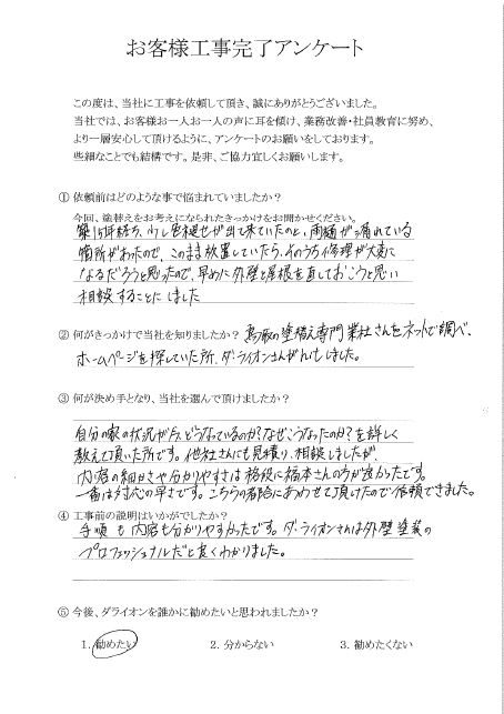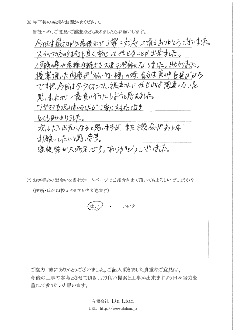 今回は最初から最後まで丁寧に対応して頂きありがとうございました。スタッフの方の対応も良く安心して任せることが出来ました。保険の事や各種手続きも大変お世話になりました。助かりました。提案頂いた内容が「松・竹・梅」の時、自分は真ん中を選びがちですが今回はダライオンさん福本さんに任せれば間違いないと思いましたので一番良いやつにしようと思えました。ワガママも沢山言いましたが丁寧に対応頂きとても助かりました。