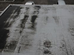 ゴムシートはヒビ割れて勾配(傾斜)がなく、水も流れていない、