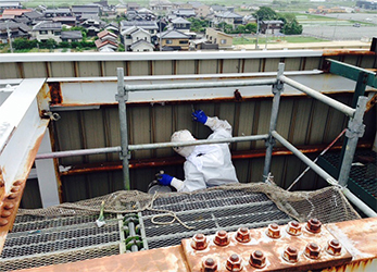 先日から看板塔内部の鉄骨塗装作業をしております。