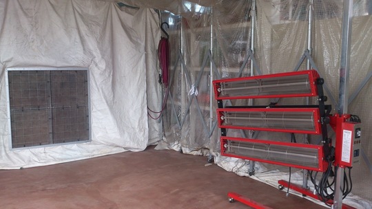 この塗装ブースの設置により、季節や天候に左右されず、また塗装作業に付随する各種部材も社内塗装後現場へ搬入することができ、工期短縮へ繋がっています。