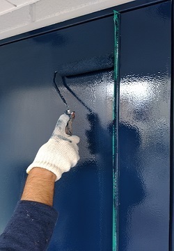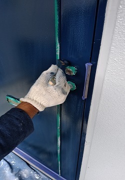 細部までしっかりと養生し、細かいところは刷毛を使い丁寧に、広い面はローラーで仕上げていきます。ドアノブの塗装も丁寧に丁寧に・・・