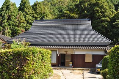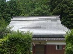 かやぶき屋根のトタンカバールーフです。 色褪せと、錆が少し発生していました。全体のケレンをしっかりした後、エポキシ錆止め1回塗、上塗りに遮熱効果のあるパラサーモシリコン2回塗です。 勾配がきつく苦労しましたが、仕上り具合が下からよく見え、色もいい感じで完成しました。