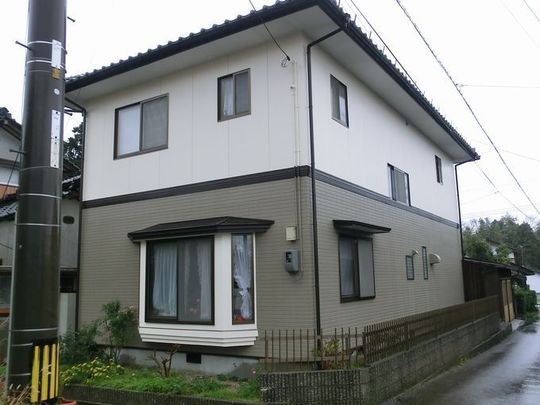 壁はサディングです。 目地シール部分がかなり傷んでいましたので、丁寧に古いシールを撤去した後、 新しくシール材を充填し、サイディングとの密着性を考え下塗りはエポキシシーラー1回塗、 上塗りは耐候性のある弱溶剤形クリーンマイルドシリコン2回塗です。 1Fの色合いを変えて落ち着いた感じに仕上がりました。