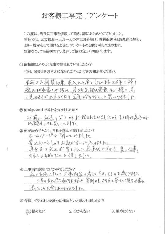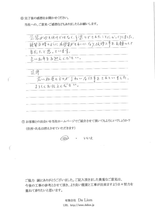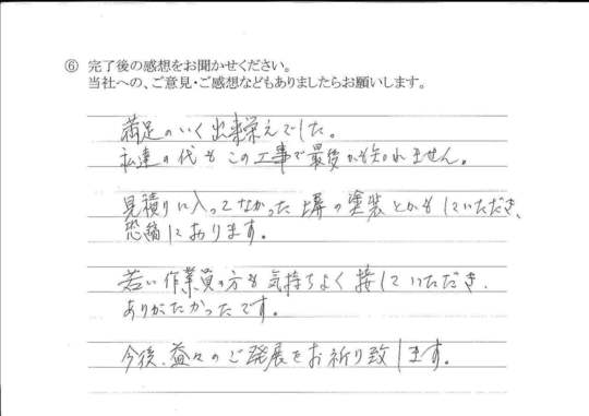 満足のいく出来栄えでした。私達の代もこの工事で最後かも知れません。見積もりにはいっていなかった塀の塗装とかもしていただき、恐縮しております。若い作業員の方も気持ちよく接していただきありがたかったです。今後、益々のご発展をお祈り致します。