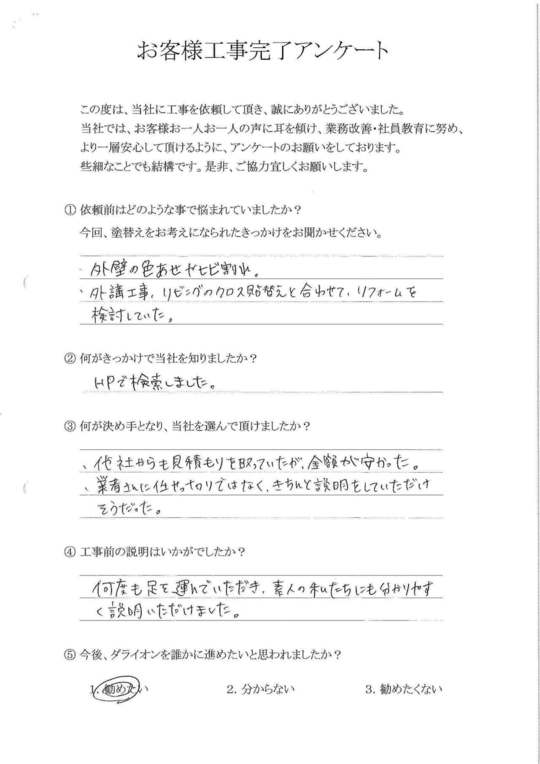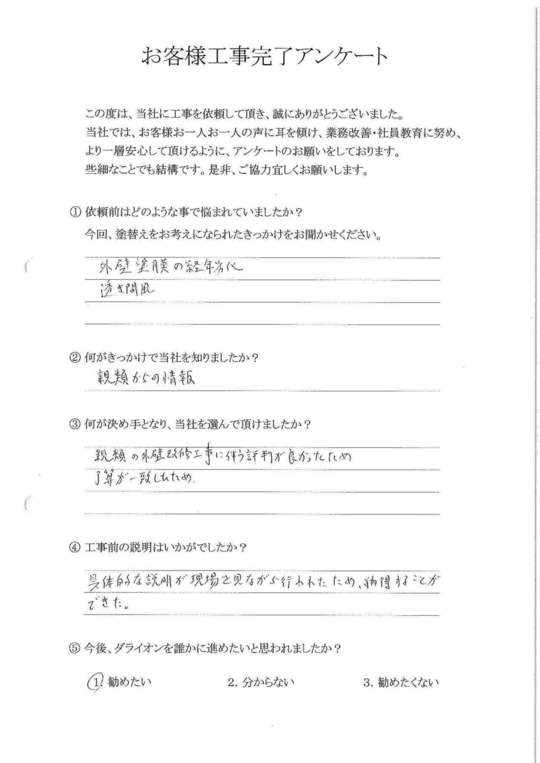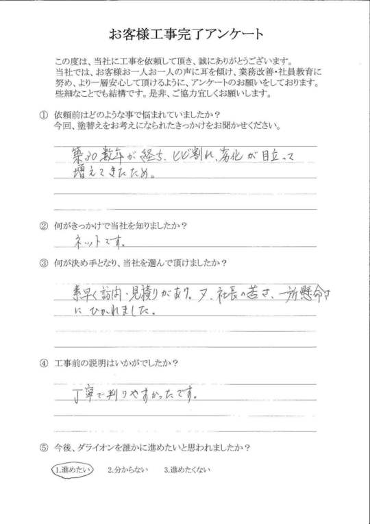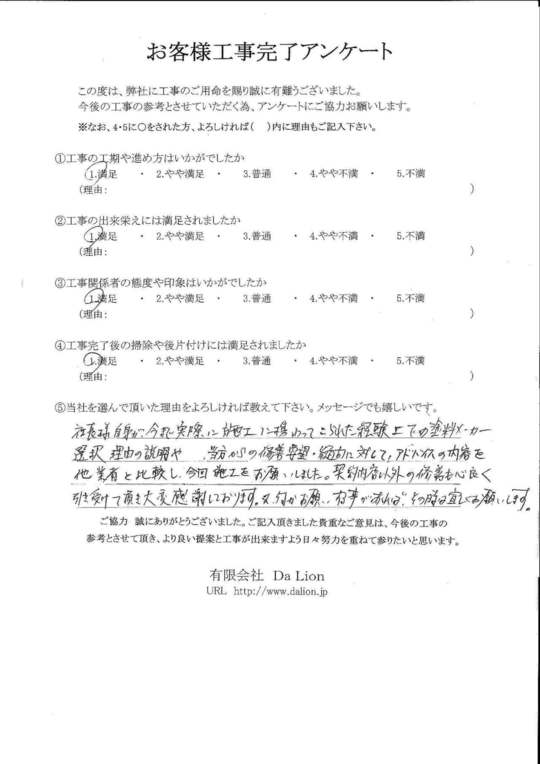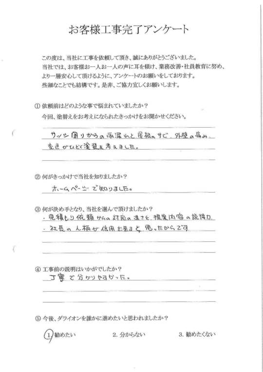 社長様自身が今まで実際に施工に携わってこられた経験上での塗料メーカー選択の理由の説明や、当方からの修繕要望・疑問に対して、アドバイスの内容を他業者と比較し、今回施工をお願いしました。契約内容以外の修繕も快く引き受けて頂き大変感謝しております。又、何かお願いする事があれば、その時は宜しくお願いします。