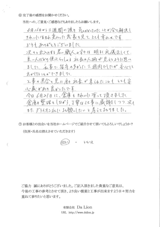 気にかかっていたことがすべて解決し、きれいに生まれ変わった我家を見てとても幸せです。どうもありがとうございました。次々と出入りする若い職人の方々は明るく礼儀正しくて、良い人ばかり使ってらっしゃる社長の人柄が見えるように思いました。私事で留守の多かった三週間でしたが安心して出かけることができました。工事の具合を見に社長が来られたこともとても安心感があり良かったです。倉庫の整理をしながら、丁寧な仕事に感謝しつつ、次もまたダライオン社にお願いしたいと考えておりました。