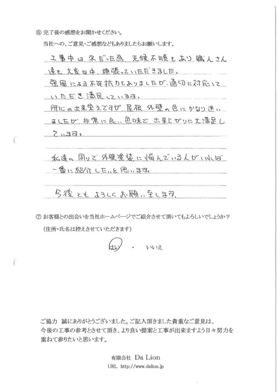 工事中は冬だった為、天候不順もあり職人さん達も大変な中、頑張っていただきました。強風による不可抗力もありましたが適切に対応していただき満足しています。肝心の出来栄えですが屋根、外壁の色にかなり迷いましたが、非常にいい色味で出来上がりに満足しています。私たちの周りで外壁塗装に悩んでいる人がいれば一番に紹介したいと思います。