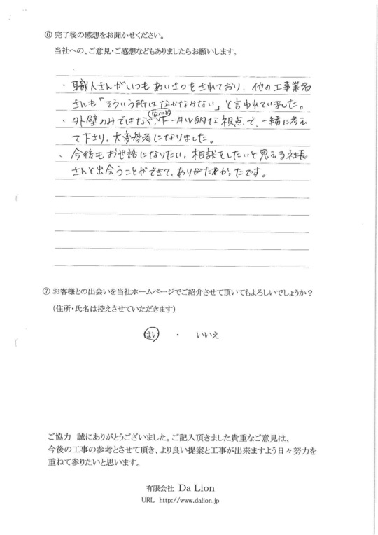 職人さんがいつもあいさつをされており、他の工事業者さんも「そういう所はなかなかない。」と言われていました。外壁のみではなく、家のことをトータル的な視点で一緒に考えて下さり、大変参考になりました。今後もお世話になりたい、相談したいと思える社長さんと出会うことができて、ありがたかったです。